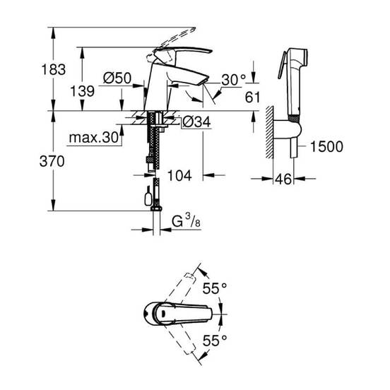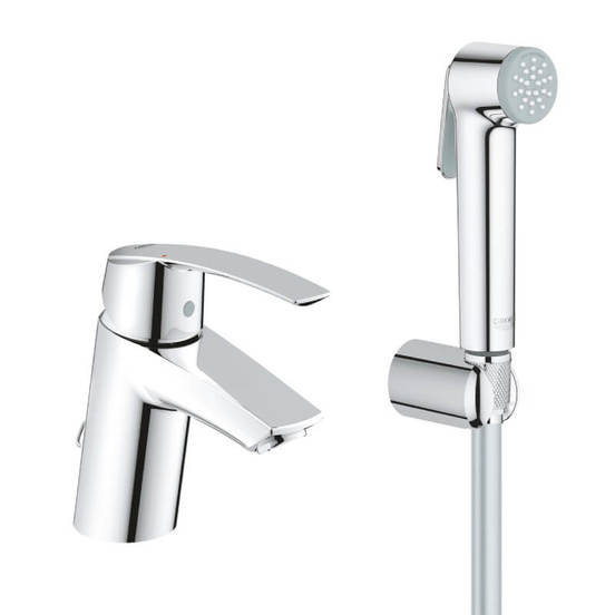 Стояща смесителна батерия за мивка за баня от серия Start на марката GROHE в комплект с хигиенен душ, шлаух и държач. Смесителят е с 35 мм керамичен затварящ механизъм. Батерията е едноръкохваткова, с индикация за топла и студена вода.
