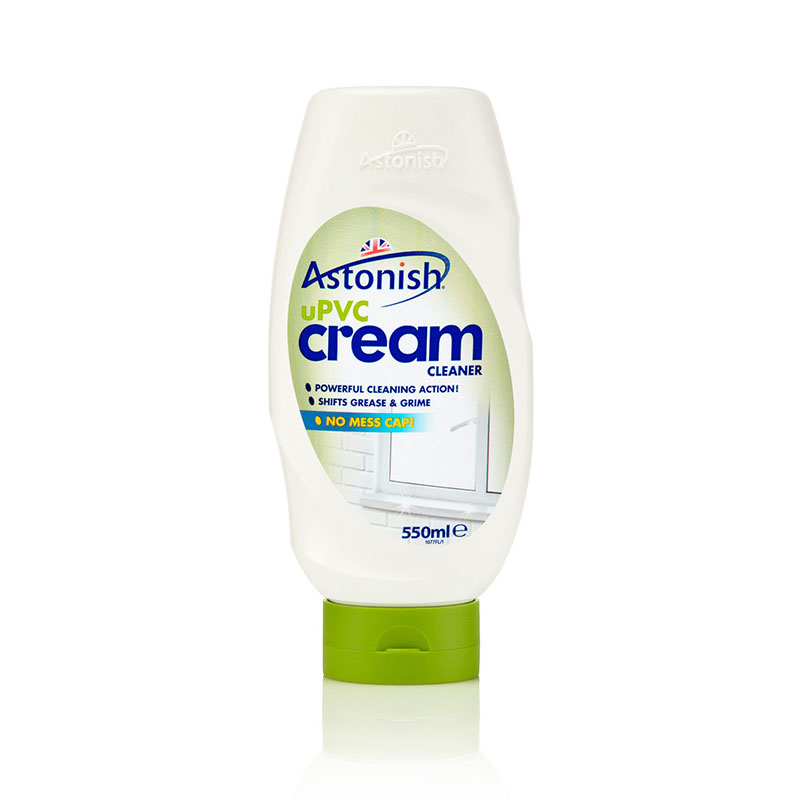 Препарат за почистване на PVC дограма на марката ASTONISH. Препаратът е във вид на крем, разработен специално, за да отстранява петна от пластмасови повърхности.