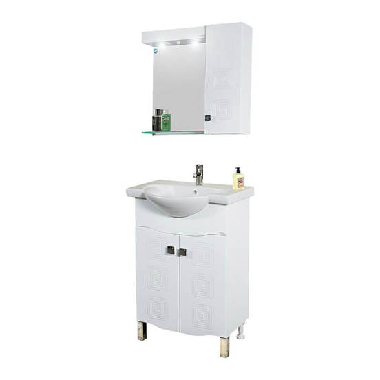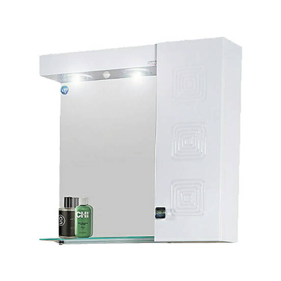 Водоустойчива мебел за баня - горен шкаф за баня с полица и вградено осветление. Шкафът с огледало за баня е произведен от висококачествен PVC с бяло гланцово покритие. Вратичката има механизъм за плавно затваряне. Разполага с два подвижни стъклени рафта, които могат да бъдат монтирани в 5 различни височини за максимално удобство при организиране на пространството в шкафа.