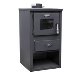 Камина на дърва Купро Ларго със свободностоящ монтаж на крачета. Отоплителният уред е с номинална топлинна мощност 13.7 kW. Има ламаринен плот. Горивната камера е облицована с огнеупорни шамотни тухли.