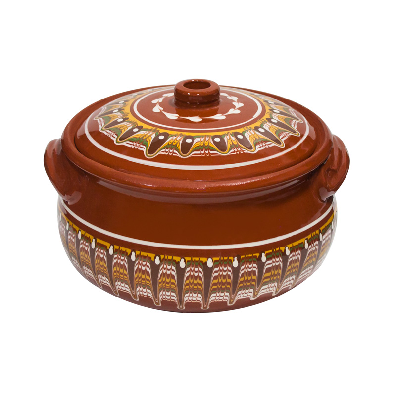 Керамичен съд с дръжки за приготвяне на гювеч. Гювечът е гланциран, цветът му е комбинация от бежово и кафяво с троянска шарка. Вместимостта на гювеча е 6.5л.