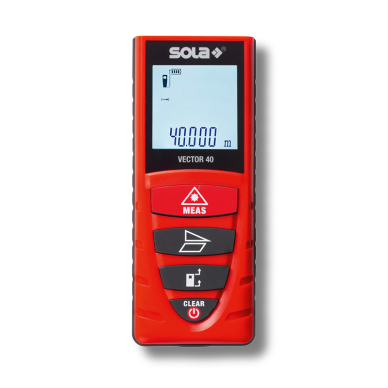 Лазерна ролетка Vector 40 на SOLA за точно измерване на отсечки и разстояния от 0.2м. до 40 метра, благодарение на разработената от SOLA лазерна технология. Лазерната ролетка Vector 40 работи с 2 броя батерии по 1.5V от вида AAA. Благодарение на компактния си размер от 120 х 48 х 27мм и ниското си тегло от 0.120кг, практичният измервателен уред се побира във всеки джоб. Лазерната ролетка Vector 40 на SOLA е изключително лесна за управление и работа. Предоставя възможност за моментално и точно измерване на дължини, както и възможност за непрекъснато измерване. За да бъде максимално удобен и функционален, лазерният измервателен уред разполага с четириканален дисплей с подсветка и автоматично изключване. Дисплеят предоставя перфектна видимост, дори и при ниска осветеност. Работната температура е от 0°C до +40°C. Може да извършва близо 5000 измервания при температура от +20°C. Възможните отклонения при измерване се намират в порядъка от ±1.50мм.