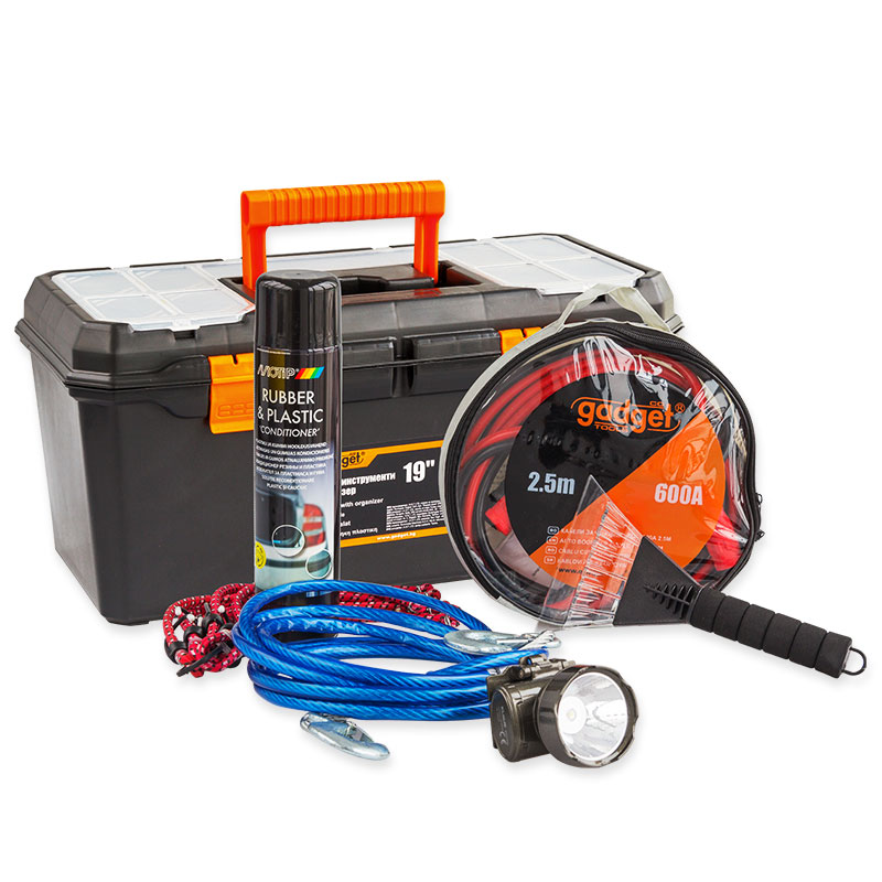 Комплект аксесоари за автомобил от първа необходимост, окомплектовани в лек, удобен и висококачествен куфар. Комплектът аксесоари за автомобил се състои от 6 части + куфар за инструменти.