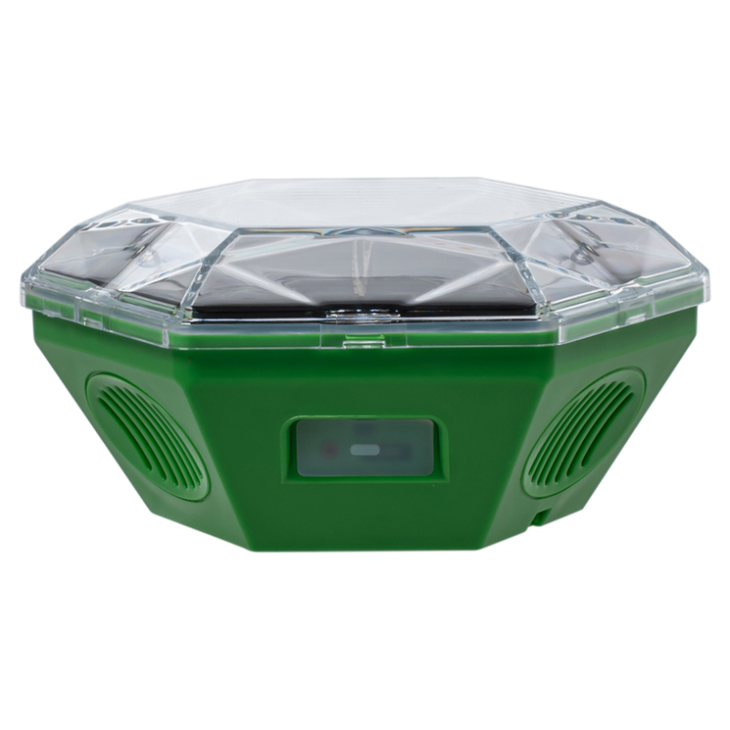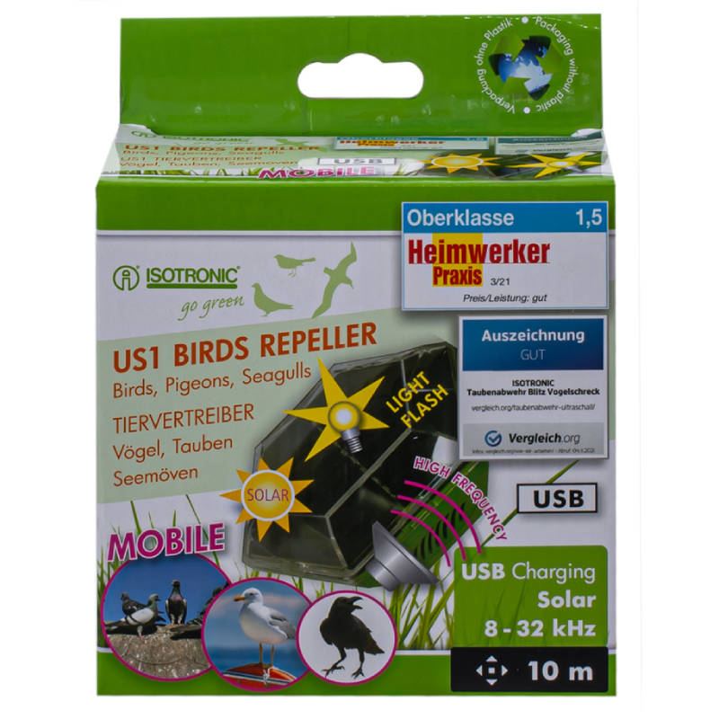 Иновативен, соларен мобилен уред за прогонване на птици на марката ISOTRONIC . Модерният уред излъчва ултразвукови сигнали в диапазон от 24000-65000 Hz +/- 500 Hz. Соларното устройство допълнително изпраща и светлинен сигнал. Специалните честотни сигнали на уреда дават възможност за защита на открити площи, които достигат до 100 кв. м. Излъчваните ултразвукови тонове са неприятни за нежеланите птици, така те напускат територията до няколко дни. Соларният уред може да се използва за защита на градини, ниви, лозя, тавански помещения, открити сгради, лодки и други места, където пребивават нежеланите птици. Качествената и фино настроена електроника на уреда гарантират неговата надеждна работа. Този уред е в състояние да отблъсква различни птици като гълъби, свраки и чайки. За разлика от ограничените по място на употреба уреди с кабели, това устройство е от нов тип. Това означава, че уредът може веднага да започне да работи на всички възможни пространства и територии. Просто го поставете там, където желаете и го включете. Соларният уред консумира минимално количество енергия. Излъчването на високочестотни тонове се извършва на интервали. Тези сигнали отблъскват птиците надалече. Захранването се състои от зареждащ се акумулатор 2 х АА Mignon 850 mAh, който се предлага с уреда. Устройството е и с USB кабел. Зареждането на уреда се извършва в продължение на 12 часа. За целта може да се използва наличният USB кабел или соларните клетки. Максималната сила на излъчваните тонове достига до 85 dB. Соларното устройство е в състояние да изпраща и LED сигнал, който е под формата на пробляскваща светлина. Уредът "Котешко око" е с клас на защита IP43, позволявайки му да функционира във влажна среда. Разполага с 3 пиезо говорителя. Предлага се с магнит за поставяне и закрепващ кабел на задната страна на уреда. На корпуса на соларния уред са разположени 2 превключвателя. Единият е за включване и продължителна работа ON/OFF. Другият е за включване ON/OFF на сензорния датчик за нощна работа. С негова помощ се редуцира звукът и се включва пробляскваща светлина.