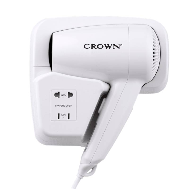 Сешоар за баня CHD-1201 WS на марката CROWN. Предвиден за стенен монтаж. Моделът е с мощност 1100W и притежава контакт за самобръсначка. Отличава се със силна въздушна струя и висока влагоустойчивост. Има автоматичен предпазител за по-голяма сигурност и безопасност при ползване. Сешоарът за баня на CROWN е с терморегулатор и бутон за включване/изключване.
