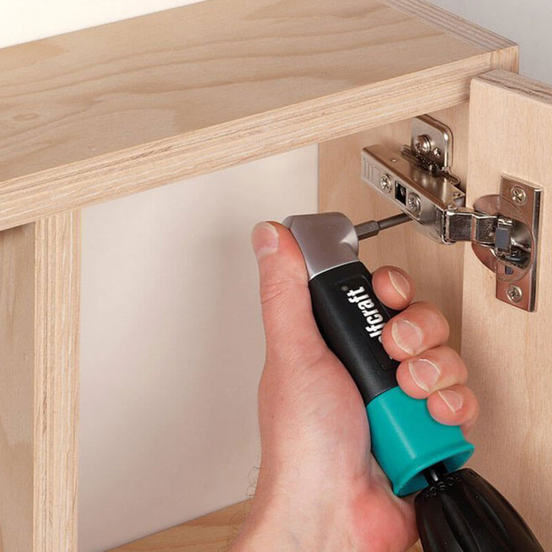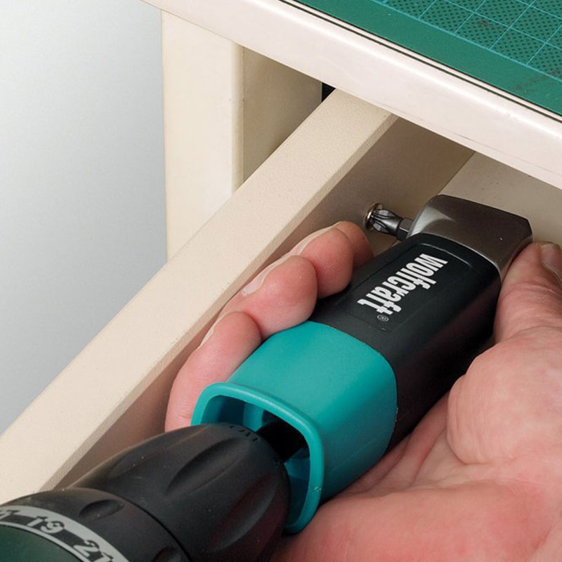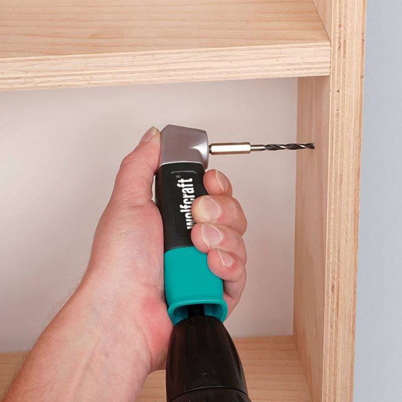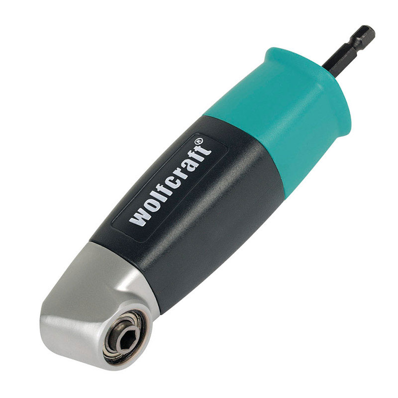 Комплект от ъглов държач и накрайник WOLFCRAFT за акумулаторен винтоверт, изработен от висококачествена хром-ванадиева стомана. Присъединителният размер е 1/4". Отличава се с постоянна ефективност, устойчивост и дълготрайност. Накрайникът е предназначен за поставяне на акумулаторни винтоверти. Идеален е за използване в тесни и труднодостъпни пространства, до които с обикновен накрайник за винтоверт не може да се работи. Ъгловият накрайник позволява въртене на ляво и дясно. Максималната скорост на накрайника е 400 об./мин. Максималният въртящ момент е 13Nm.