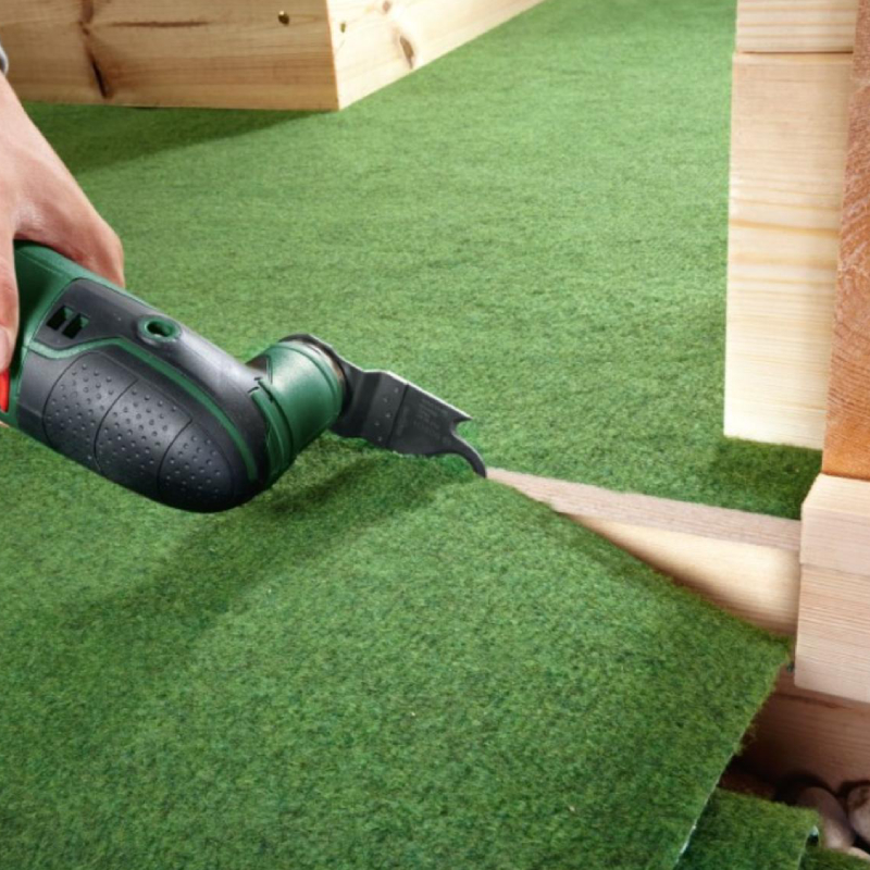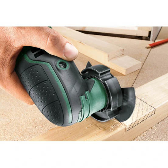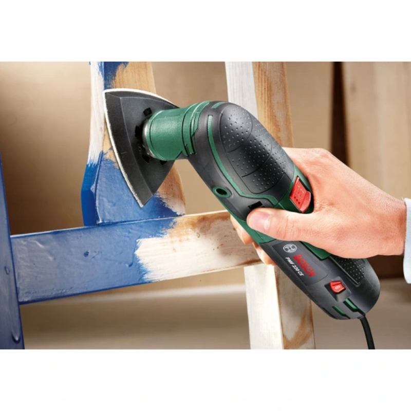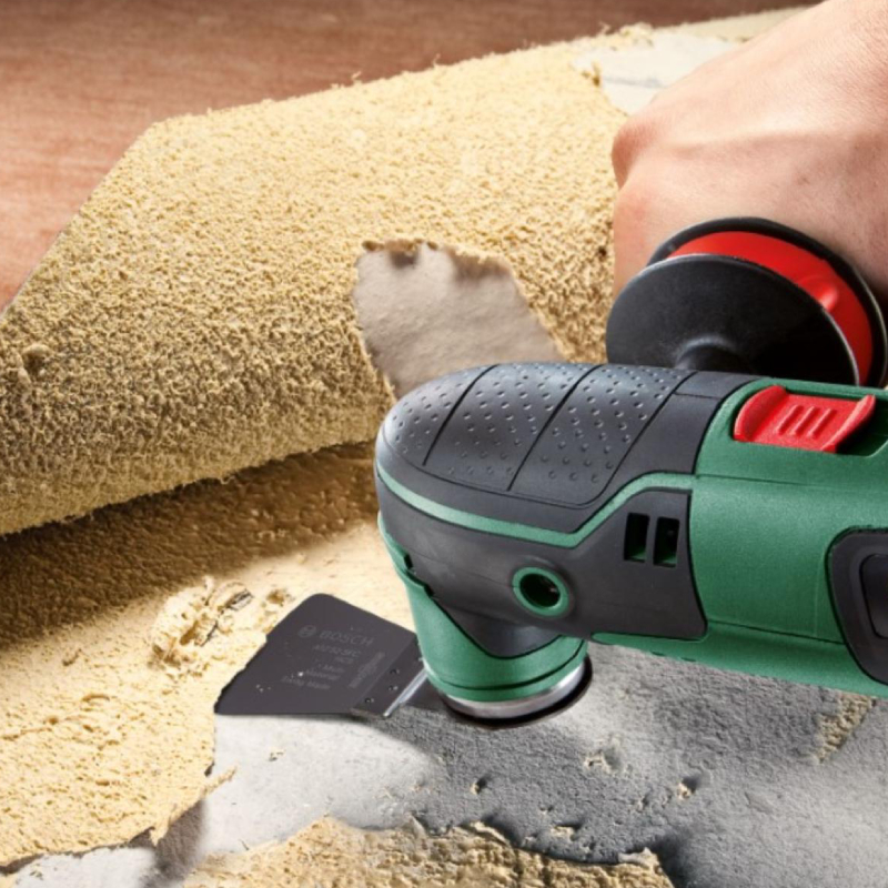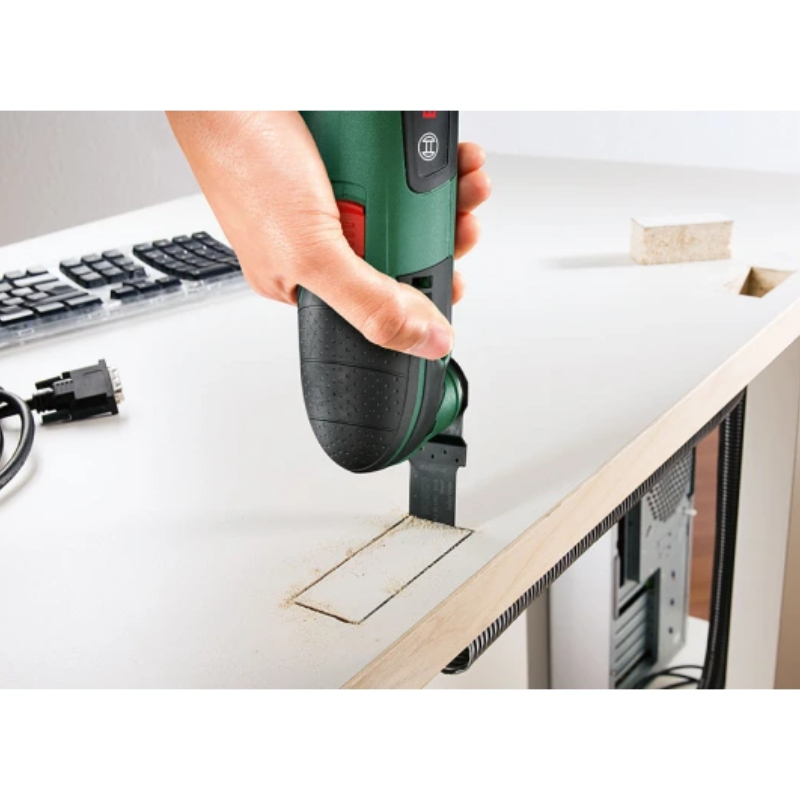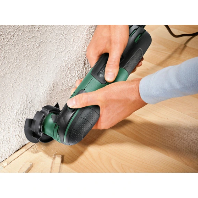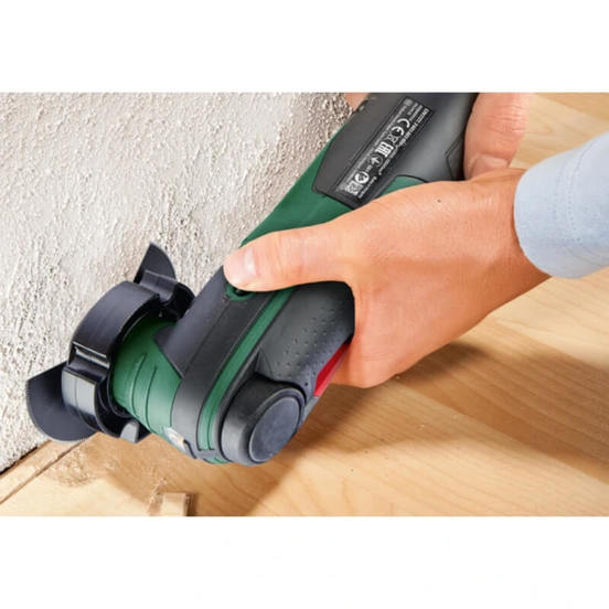 BOSCH PMF 220 CE е универсален мултифункционален инструмент с номинална мощност 220 W и обороти на празен ход до 20.000 об./мин, проектиран за прецизна работа върху дърво, метал и пластмаса. Технологията Constant-Electronic поддържа постоянна мощност дори при натоварване, като осигурява стабилни и точни резултати при рязане, шлайфане и обработка на различни материали. Инструментът използва иновативната система Curved-Tec, която гарантира плавно врязване чрез закръглените режещи ръбове на потопяемите ножчета, а безстепенната настройка на честотата на осцилацията и ъгълът на движение 2.8° вляво и вдясно позволяват прецизно адаптиране към конкретния материал и тип работа.