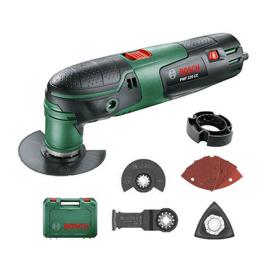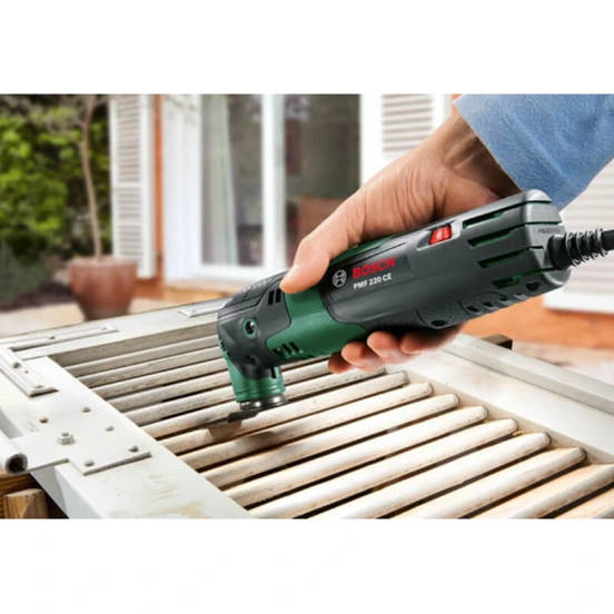 BOSCH PMF 220 CE се предлага с пълна окомплектовка за максимална готовност за различни задачи: 4-степенен дълбочинен ограничител за сегментни ножчета, BIM-сегментно ножче Wood and Metal, 85 мм (ACZ 85 EB), HCS потопяемо ножче за дърво, 32 x 40 мм (AIZ 32 EPC), комплект шкурки за делташлайф, пластмасов куфар за съхранение и транспорт, плоча за делташлайф 93 мм (AVZ 93 G) и "Г"-образен шестостенен ключ. Тази комбинация от инструменти и аксесоари прави PMF 220 CE готов за широк набор от приложения, от детайлно рязане и шлайфане до прецизно оформяне и обработка на повърхности.