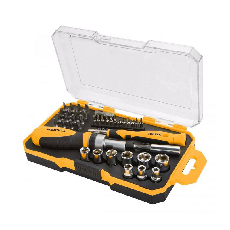 Комплект отвертка с тресчотка TOLSEN, състоящ се от 42 отделни части. В него са включени различни битове и вложки. Изработени са от висококачествена поцинкована стомана, устойчива на корозия, износване и дълготрайна употреба. Комплектът включва адаптер и магнитен държач. Битовете и вложките са 16 бита с размери 6.35 х 25мм:
