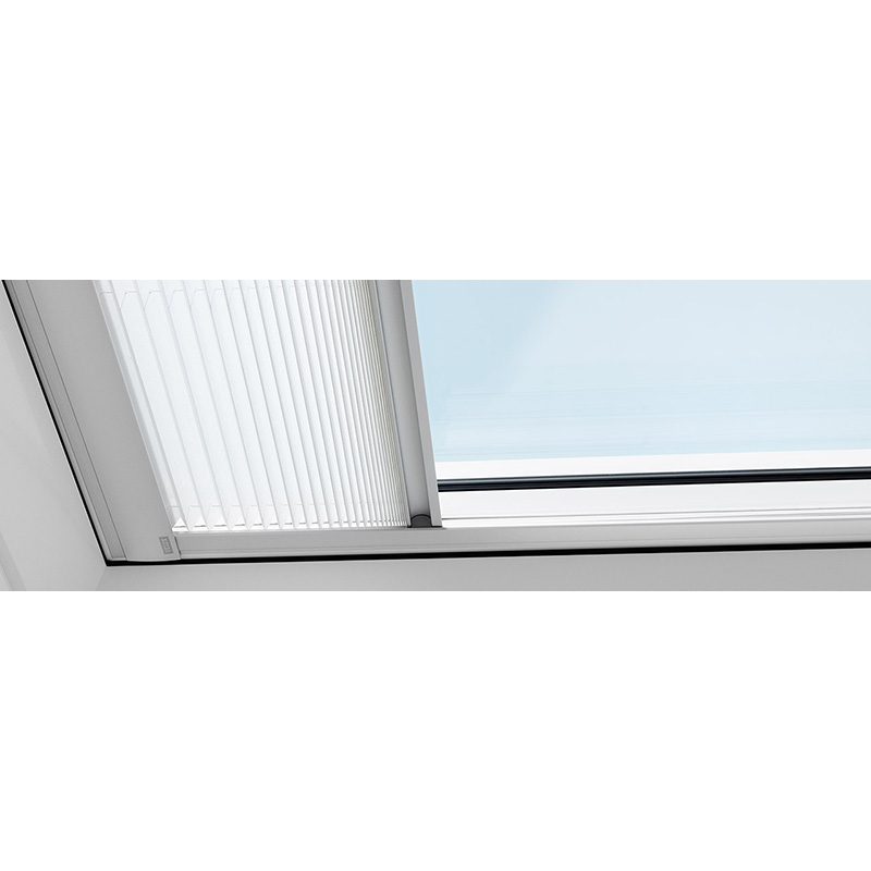 Плисирана щора FMG за прозорец за плосък покрив на марката VELUX. Моделът е с размери 120 х 120см и се управлява с дистанционно, като се захранва електрически.