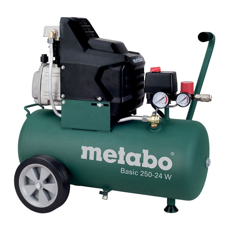 Бутален компресор за въздух Basic 250-24W на марката METABO. Компресорът е от вида маслени и е монофазен. Има обем на резервоара 24л и мощност 2 к.с./1.5kW. Представлява надеждна машина за занаятчийско приложение. Гарантира голям дебит по време на работа - 200л/мин (навътре) и 110л/мин (навън).