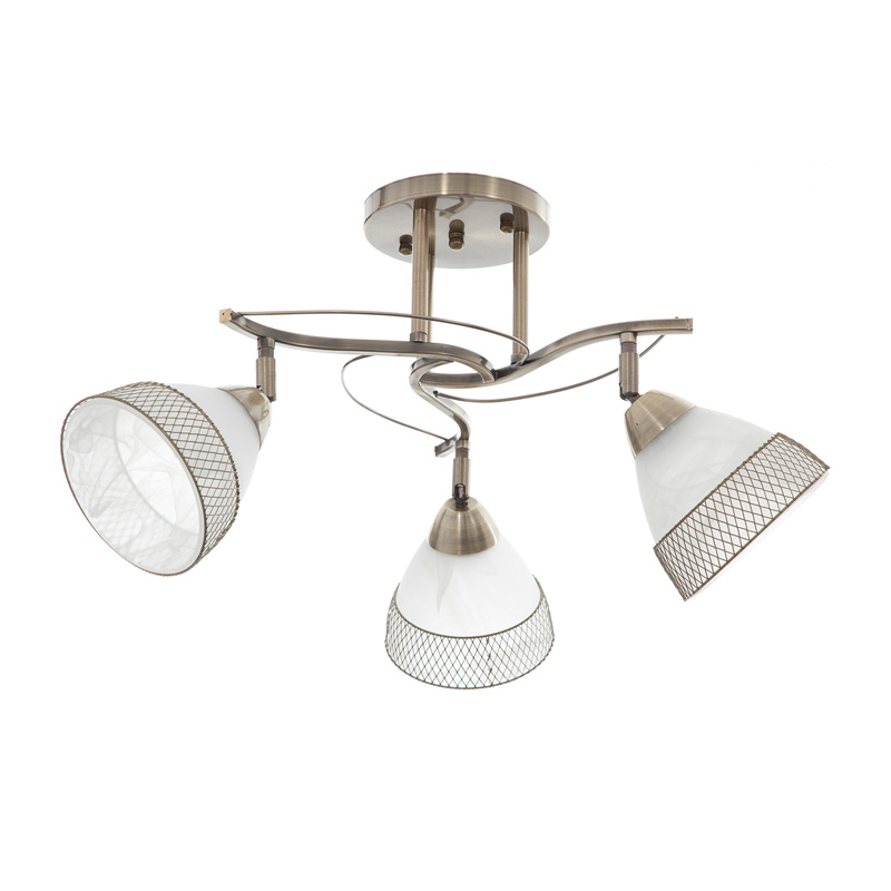 Осветително тяло - Плафон тройка с насочваща светлина RIVER EL BULGARIA с размер 40 х 33см, мощност 3 х 40W и цокъл 3 х E27. Със своя стилен дизайн, плафона е подходящо осветление за спалня, всекидневна, хол, детска стая и трапезария. Предназначен е за стационарен монтаж на таван. Предоставя висока степен на светлинния поток и възможност за насочване на светлината в желаната от вас посока. Осветителното тяло от вид плафон е изработено от метал в цвят матиран месинг с осветяваща част от декоративно стъкло с красиви орнаменти.