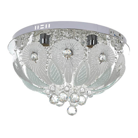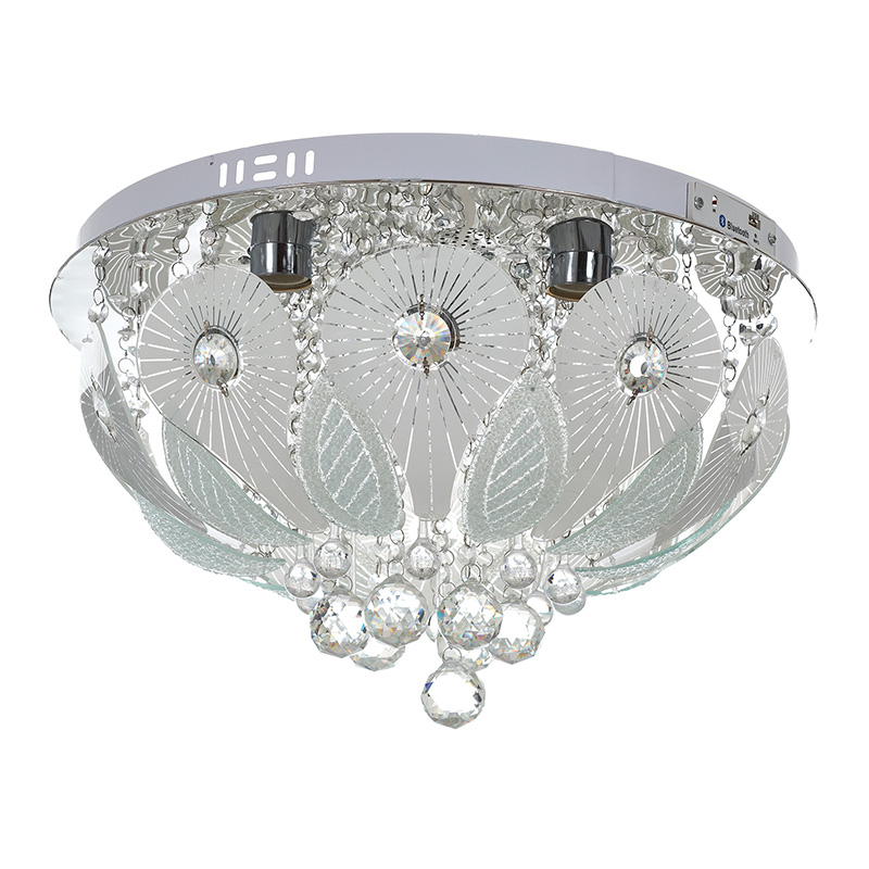 Музикален плафон от EL BULGARIA с Bluetooth, два режима на осветяване (RGB LED и електрически крушки). Плафониерата е с 6 броя крушки с фасунга Е27 и вградено RGB LED осветление, което свети в различни цветове. Лмпата за таван има дистанционно управление, вграден MP3 Player с USB порт, високоговорители и Bluetooth.