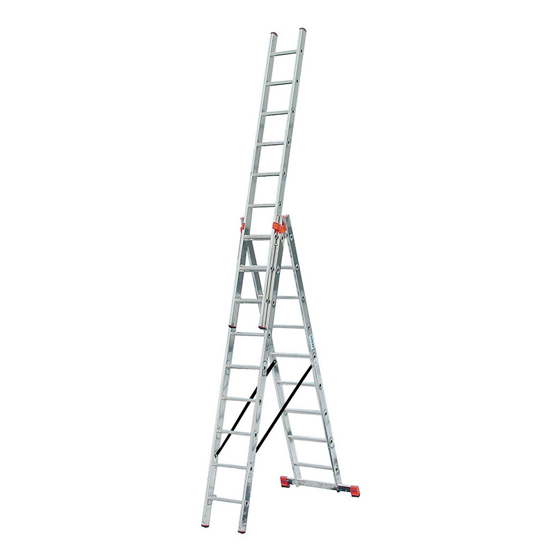 Трираменна алуминиева стълба за разностранна употреба. Професионалната стълба може да се използва по няколко начина - подпираща се, стояща и изтегляща се.