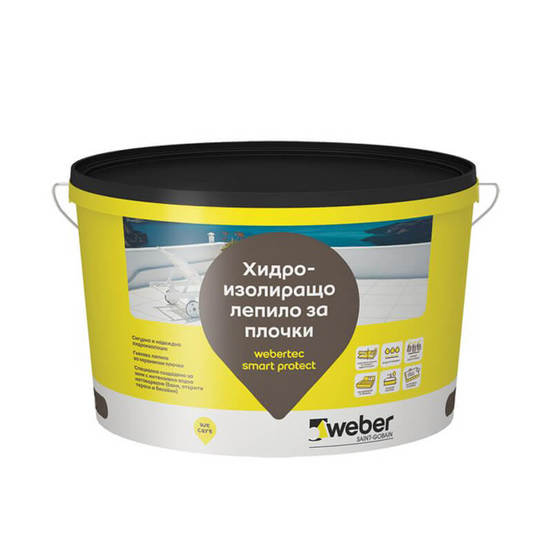 Хидроизолиращото лепило за плочки webertec smart protect представлява високотехнологична система, състояща се от хидроизолация и лепило за плочки. След втвърдяване е силно еластична, водоустойчива, студоустойчива, сулфатоустойчива и UV-устойчива.