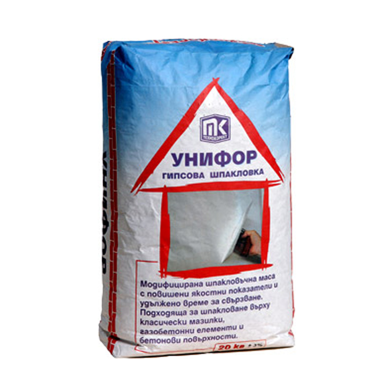 Унифор запазва работна гъстота до 35-40 минути при температури 5-25°C, което спомага за пълното използване на разбърканите количества. Шпаклованите стени изсъхват напълно до 90 минути след полагането.