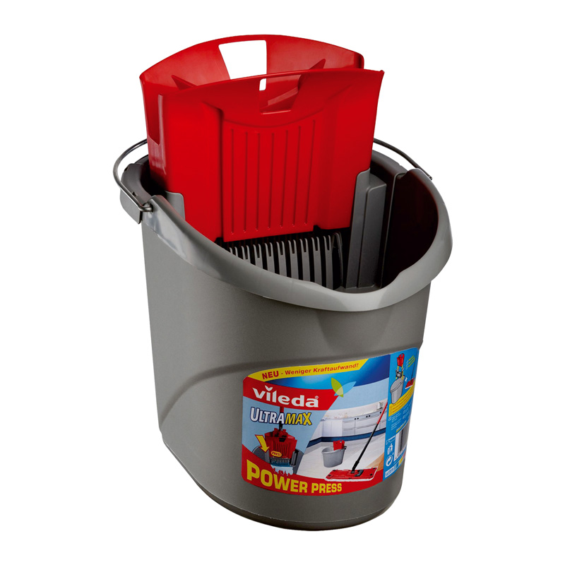 Комплект за почистване Ultramax на VILEDA, състоящ се от пластмасова кофа с изстисквач и моп с микрофибърна подложка.