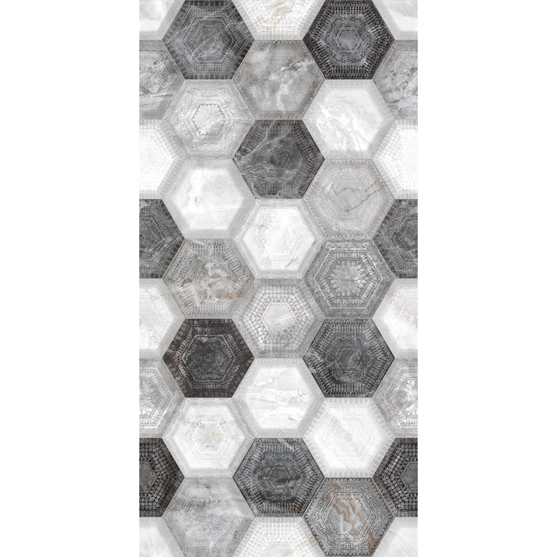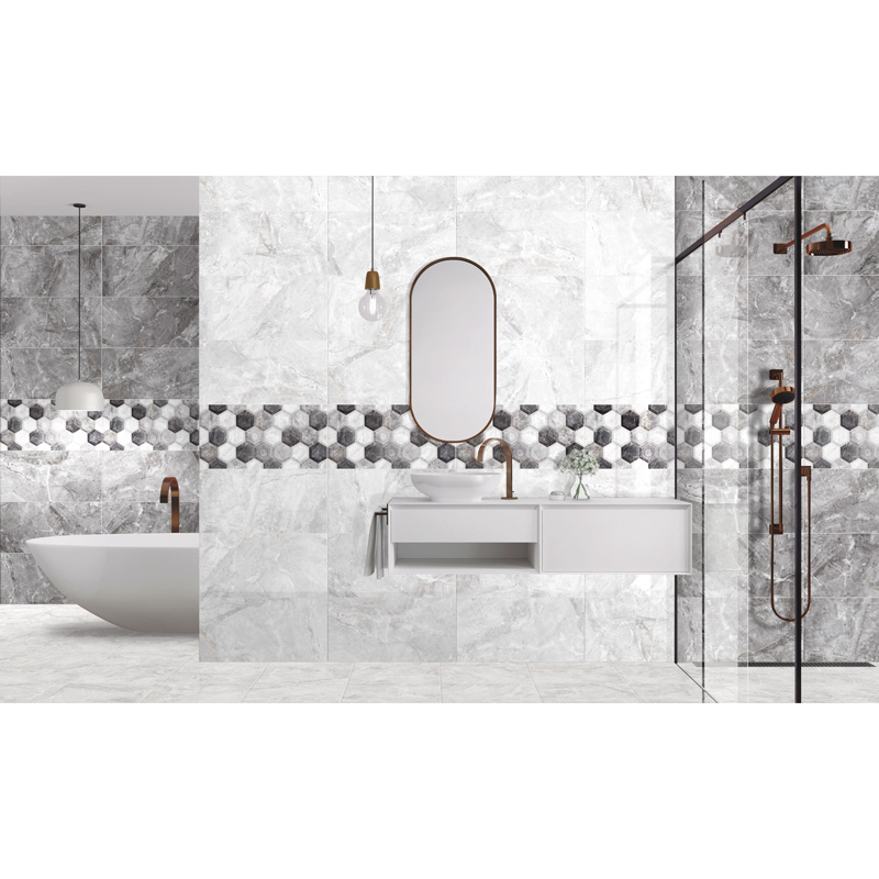 Декор плочка Дари. Плочката е с размер 30 х 60см и с дебелина 9.5мм. Повърхността й е гланцирана, релефна и в нюанси на сивия цвят. Почиства се лесно и е подходяща за полагане в закрити помещения.