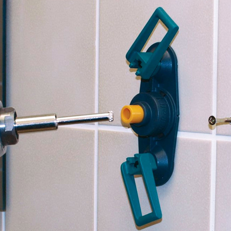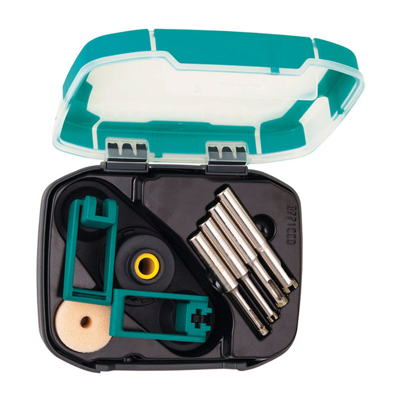 Комплект боркорони за керамика и гранитогрес с върхове с диамантен прах и цилиндрични опашки. В комплекта са включени 4 броя боркорони с диаметър от Ф5мм до Ф10мм и водач. Водачът е снабден с вендузи, които фиксират водача в неподвижно положение за максимално точно пробиване на плочката.
