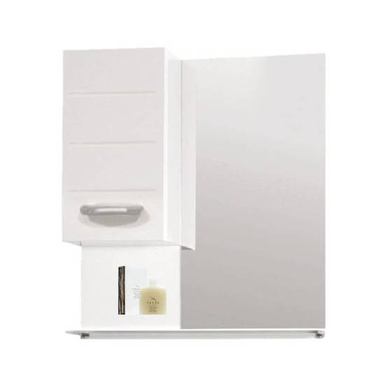 Водоустойчива мебел за баня - горен шкаф за баня с огледало. Шкафът с огледало за баня е произведен от висококачествен PVC с бяло гланцово покритие. Разполага с полица и вратичка с механизъм за плавно затваряне, зад която е поместен 1 статичен рафт.