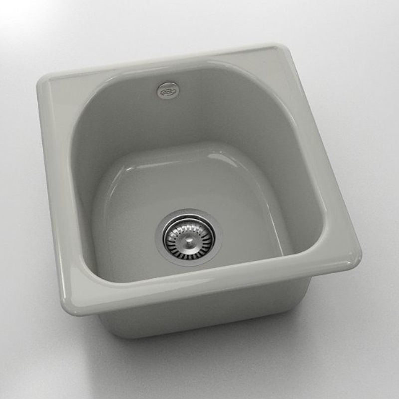 Единична кухненска мивка за вграждане на марката FAT. Изработена от полимермрамор с габаритни размери 43 х 46 см в цвят инокс. Към комплекта е включен висококачествен италиански сифон за мивка с размер ф90 мм.