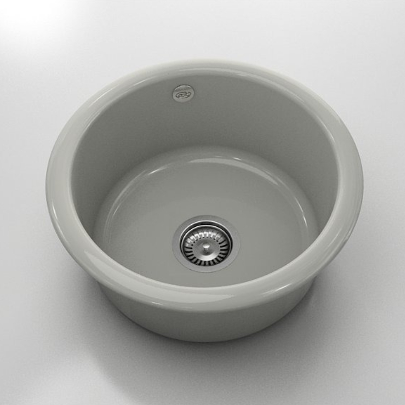 Кръгла кухненска мивка за вграждане на марката FAT. Изработена от полимермрамор с габаритен диаметър ф49 см в цвят инокс. Към комплекта е включен висококачествен италиански сифон за мивка с размер ф90 мм.