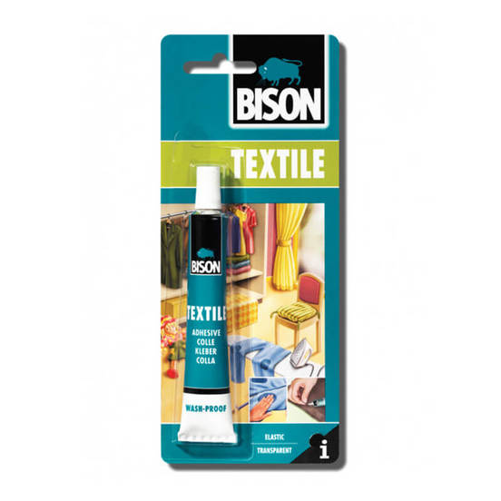 Лепило за текстил Textile на марката BISON. Лепи превъзходно различни видове текстил, кече, филц, лен, памук, кокосово влакно едни към други и към дърво, хартия и др. За подгъви на завеси, пердета, джинси, кръпки, килими, поправка на дрехи, палатки, дюшеци и текстилни елементи на чадъри, кутии, чанти, пейки, столове.