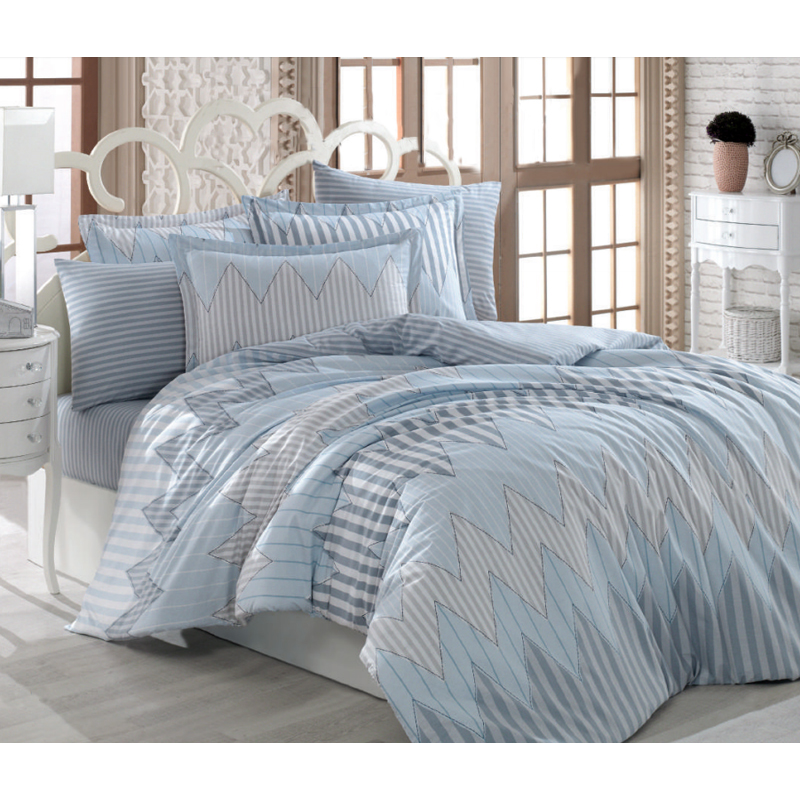 Единичен спален комплект AKHOME от серията Fancy син в 3 части. Изработен от висококачествен плат Ранфорс - 100% памук. Спалният комплект се състои от долен чаршаф, плик за завивки и калъфка за възглавница. Всички части са в щампиран десен. Ранфорс е основен тип тъкан за спално бельо, която се характеризира с висока трайност, плътност, здравина и отлични хигиенни свойства.