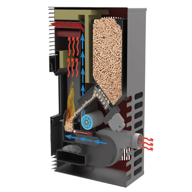 Запалването на пелетите се случва посредством керамичен нагревател и се случва за секунди. Сензори с най-различни функции контролират процеса на горене, температурата на водата и димните газове, което е допълнителна гаранция за сигурността на камините по време на работа.