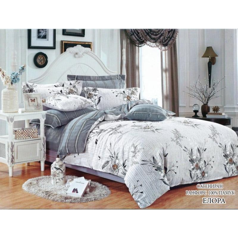 Спален комплект Елора в 3 части. Изработен от висококачествен плат - 100% памук сатен. Спалното бельо на МОНИ ТЕКСТИЛ се състои от чаршаф, плик и калъфка за възглавница. Частите са в щампиран десен.