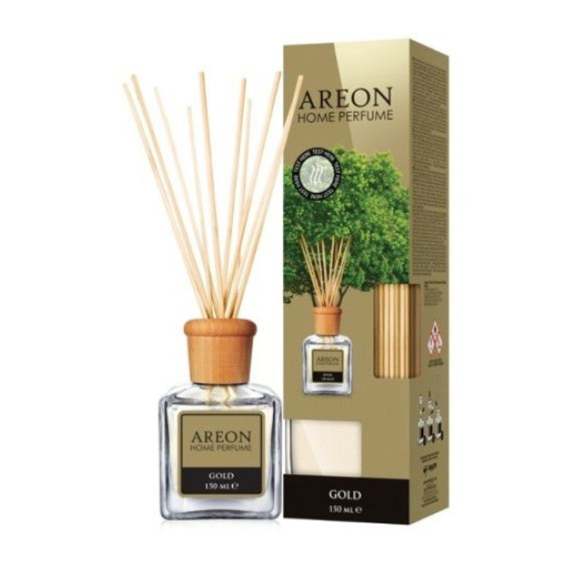 Ароматизатор във вид на стъклено шише и ратанови клечки на марката AREON. С аромат Gold. Представлява обаятелен парфюм, който внася стил и комфорт. Ароматизаторът е подходящ за употреба както във вашия дом, така и в работния офис. Разпръсква мощно и свежо ухание.