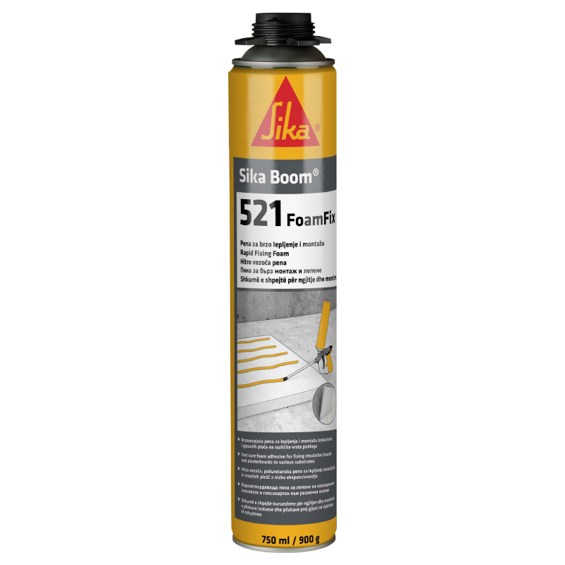 Бързовтвърдяващата се полиуретанова пяна на SIKA, модел Boom 521 е еднокомпонентна полиуретанова пяна с много ниска степен на разширение. SIKA Boom 521 FoamFix е лесен за употреба при гипсокартон и следните изолационни материали: