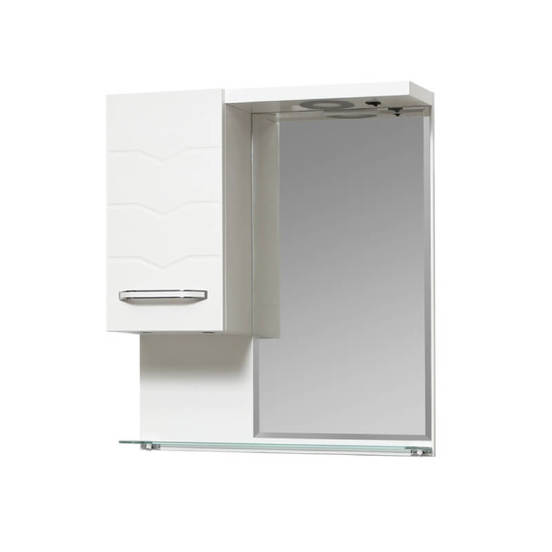 Водоустойчива мебел за баня - горен шкаф за баня с полица и вградено осветление. Шкафът с огледало за баня е произведен от висококачествен PVC с бяло гланцово покритие. Вратичката има механизъм за плавно затваряне. Разполага с един статичен рафт.