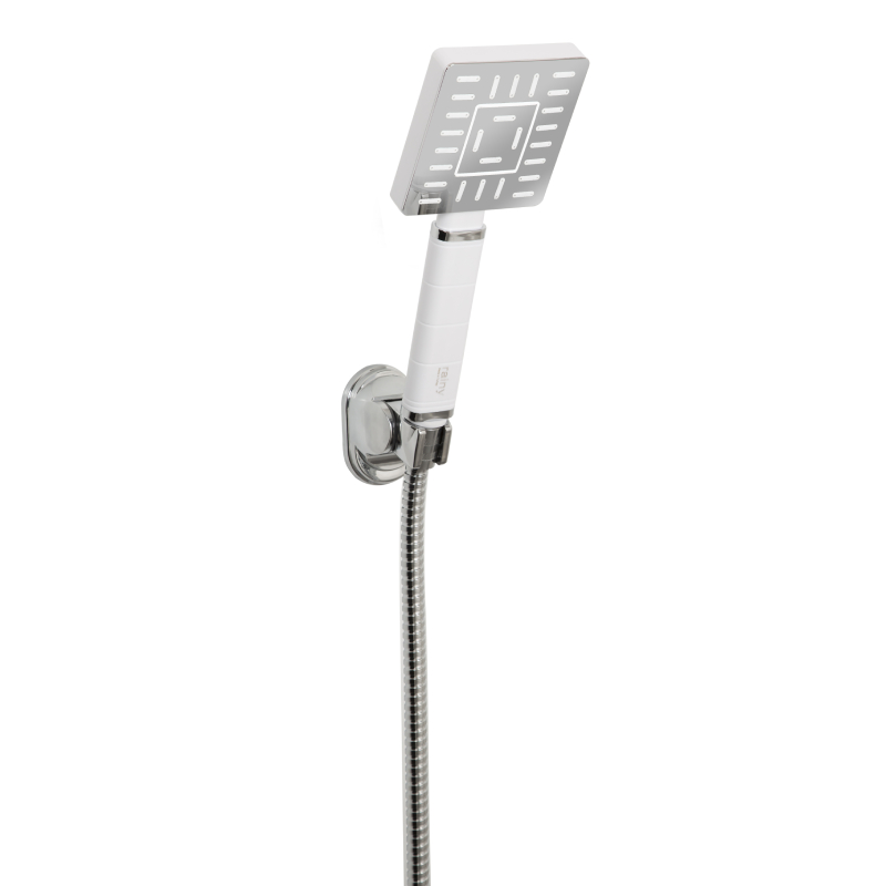 Комплект за баня с ръчен душ, стенен държач за ръчен душ и шлаух, модел Tetra на турската фирма DIAMOND. Всички елементи от комплекта са произведени от висококачествена ABS суровина, която гарантират максимална устойчивост през целия период на експлоатация. Модел Tetra е снабден със система за пестене на водата, както и със защита от натрупване на варовик. Продуктът е TSE и CE сертифициран, което гарантира неговото качество и надеждност. Ръчният душ със своята ненатрапчива правоъгълна форма и бяло-хромирана повърхност придава усещане за стил и допринася за комфорта в банята.