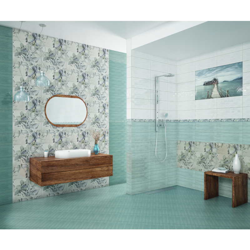 Декор плочка Мечтание от серията Виола на марката KAI в преобладаващо зелен цвят. Предлага се в комплект от 6 броя плочки с размер 20 х 50 см. Така общият размер на декор плочката става 60 х 100 см.