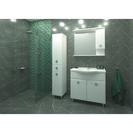 Колоната е на крака, с ляво или дясно отваряне и размери 30 х 33.9 х 190см. с кош за пране, чекмедже и два подвижни рафта.