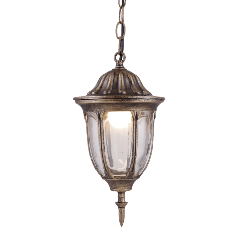 Градински фенер от серията Tosca на марката VIVALUX. Предназначен за окачване на таван. Фенерът е с алуминиев корпус в цвят античен месинг. Има 6 стъклени стени. Размерите му са 16.3 x 16.3 x 110см, като 110см е общата дължина.