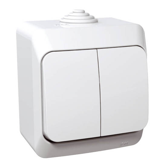 Двоен/сериен електрически ключ за осветление от серията Cedar Plus на марката SCHNEIDER ELECTRIC. Изработен от висококачествена пластмаса в бял цвят. Предназначен за открит монтаж. Ключът е с висока степен на защита IP44, която го прави водоустойчив и подходящ за външна употреба, както и във влажни помещения.