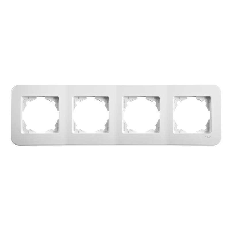 Четворна декоративна рамка-модул за монтиране на електрически ключове и контакти Rollina на маркеата VIKO BY PANASONIC. Рамката е тип хоризонтална. Изработена е от пластмаса в бял цвят.