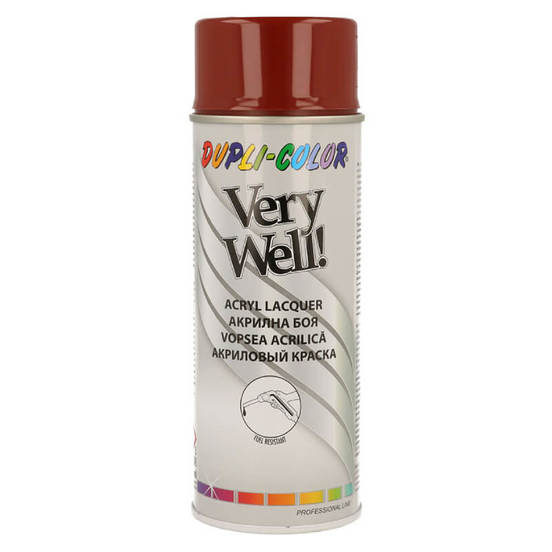 Висококачествената акрилна боя Very Well на DUPLI COLOR съчетава в себе си предимствата на акрилните бои и богатата цветова гама по RAL. Подходяща e за хоби и професионални приложения. Изсъхва на допир след около 10 до 30 мин, а напълно след 1 час. Може почти мигновено да се препокрива със следващ слой - лесно, удобно и без загуба на време. Специалната ú формула я прави изключотелно устойчива на атмосферни влияния, бензин и масла.