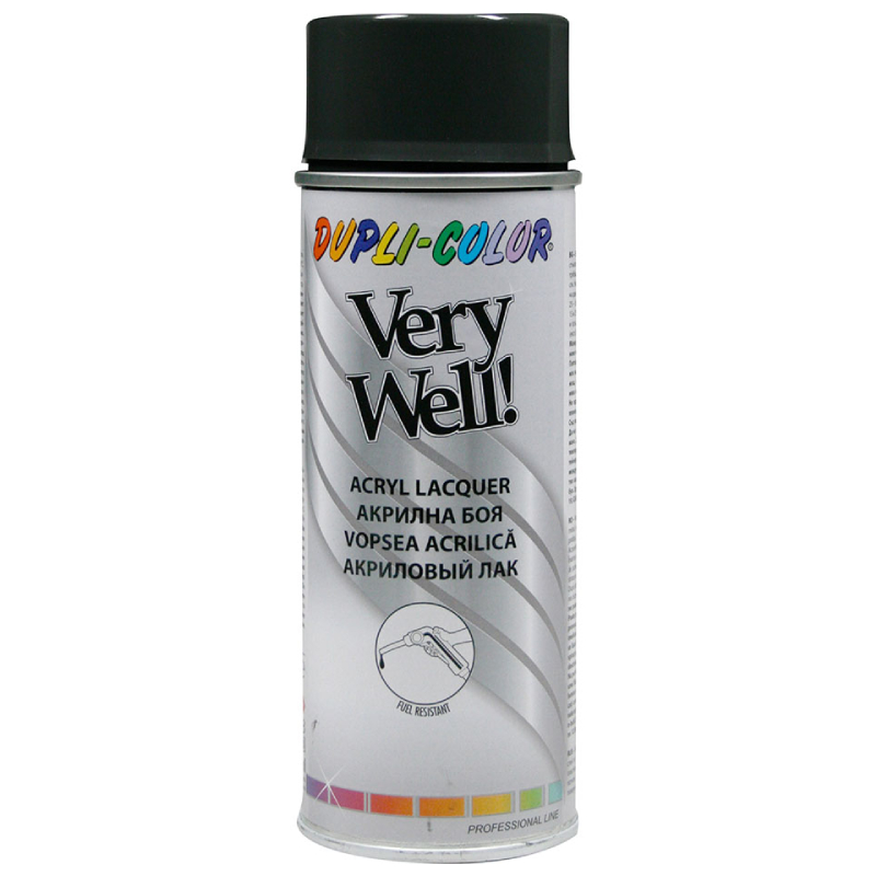 Висококачествената акрилна боя Very Well на DUPLI COLOR съчетава в себе си предимствата на акрилните бои и богатата цветова гама по RAL. Подходяща e за хоби и професионални приложения. Изсъхва на допир след около 10 до 30 мин, а напълно след 1 час. Може почти мигновено да се препокрива със следващ слой - лесно, удобно и без загуба на време. Специалната ú формула я прави изключотелно устойчива на атмосферни влияния, бензин и масла.