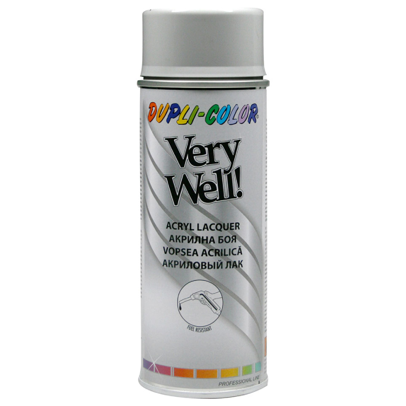 Висококачествената акрилна боя Very Well на DUPLI COLOR съчетава в себе си предимствата на акрилните бои и богатата цветова гама по RAL. Подходяща e за хоби и професионални приложения. Изсъхва на допир след около 10 до 30 мин, а напълно след 1 час. Може почти мигновено да се препокрива със следващ слой - лесно, удобно и без загуба на време. Специалната ú формула я прави изключотелно устойчива на атмосферни влияния, бензин и масла.
