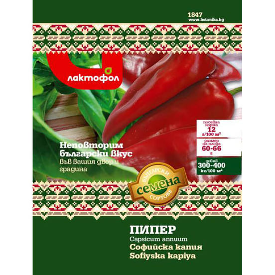 Пиперът Софийска капия е ранен сорт, тип едроплоден, с вегетационен период 115-120 дни. Растението е прибрано, високо 50-70см. с къси междувъзлия и 3 - 5 разклонения. Листата са тъмнозелени. Плодовете са висящи, сплеснати, към дръжката леко заоблени дълги 12 - 16см, широки в основата 5 - 7см. Месото е сочно, сладко, дебело 4 - 5мм. Кожицата лесно се обелва при печене. Зелените плодове са тъмнозелени, узрелите - тъмночервени. Средното тегло на плода е 60 - 66гр. Предназначен е за прясна консумация, мариноване и консервиране.