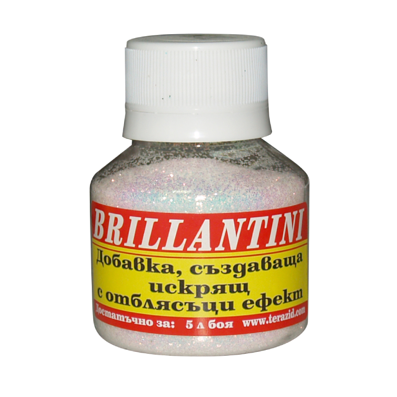 Декоративното брокатено покритие Brillantini на ТЕРАЗИД представлява цветнa добавкa с отблясъци и искрящ ефект за всякакви видове латекс и декоративни бои. Продуктът е предназначен за интериорна и екстериорна употреба. Добавката се изсипва в боята непосредствено преди нанасяне, след което се разбърква на ръка. Добавя се внимателно до постигане на желания ефект. За да се избегне пренасищане на боята се препоръчва проба преди окончателно нанасяне. Шише от 0.30 гр е достатъчно за 5 литра латекс или декоративна боя.