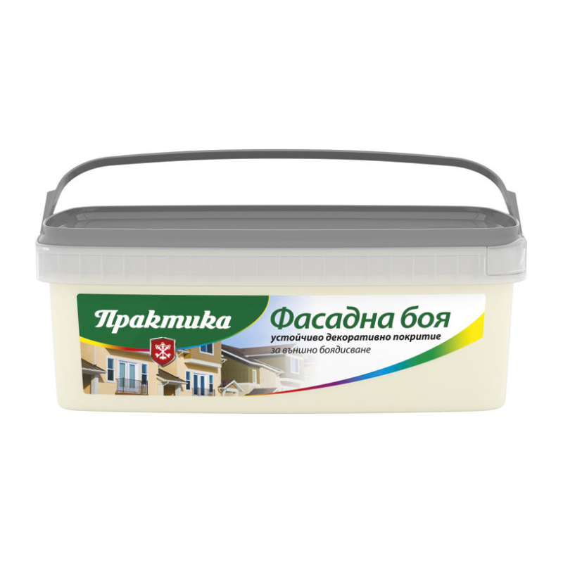 Устойчива фасадна боя ПРАКТИКА в цвят магнолия и матов ефект. Предназначена за външно боядисване. Боята се нанася върху здрави, добре почистени повърхности. Нови повърхности се грундират с подходящ грунд за стени. Нанася се в два слоя през интервал от време от около 3 часа с четка, валяк или бояджийски пистолет. Работи се при температура над 10°С. След работа инструментите се почистват веднага с вода.