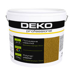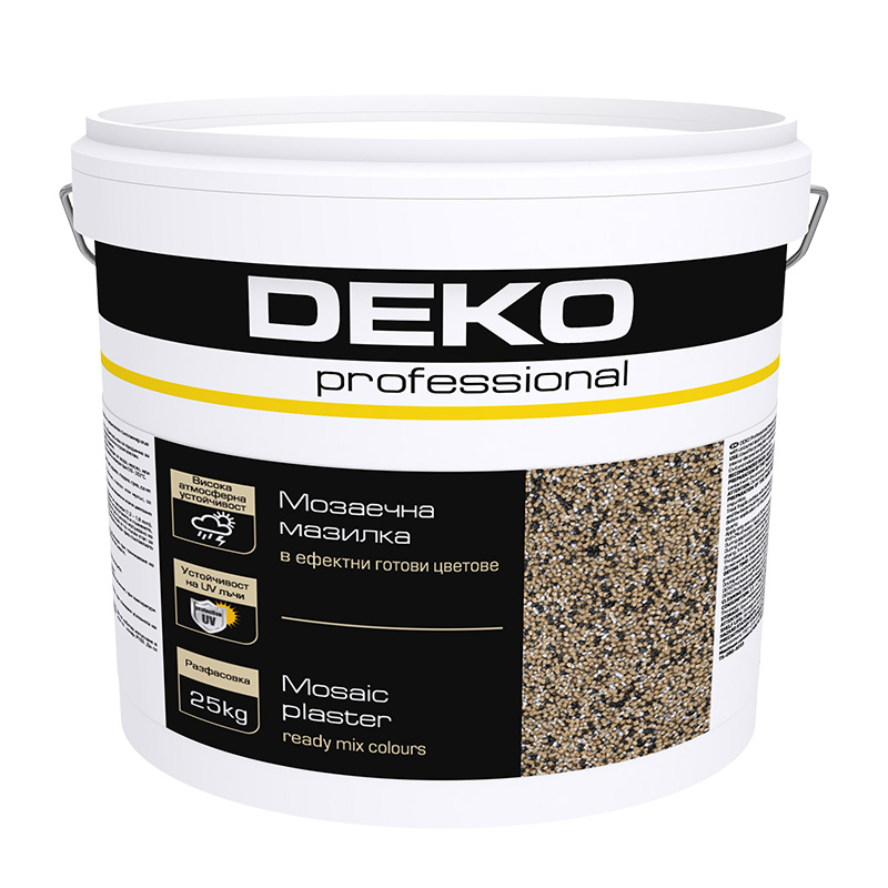 DEKO professional мозаечна мазилка е произведена на базата на водна дисперсия от акрилни съполимери, добавки и частици кварц. Използва се за специален структурен завършек за вътрешни и външни повърхности. Устойчива на стареене, драскане и удари.