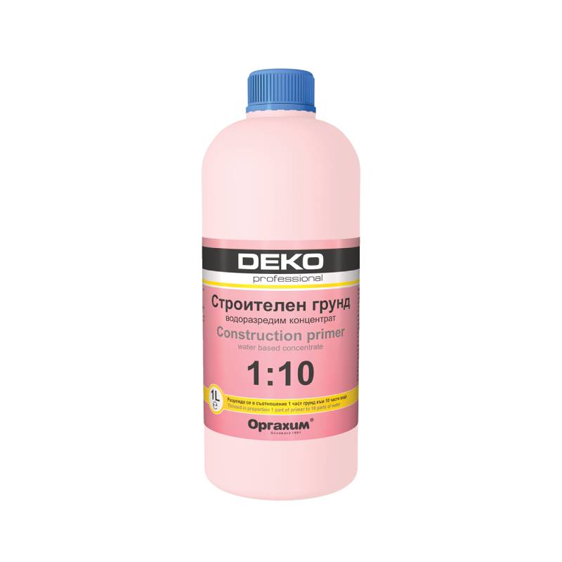 Водоразредим строителен грунд DEKO professional е продукт произведен на базата на водна емулсия на акрилатен съполимер и специални добавки, придаващи специфични потребителски и технологични характеристики. Предназначен за импрегниране преди вътрешно и външно боядисване. Грундът прониква в порите на основата, заздравява я и уеднаквява попиващата й способност.