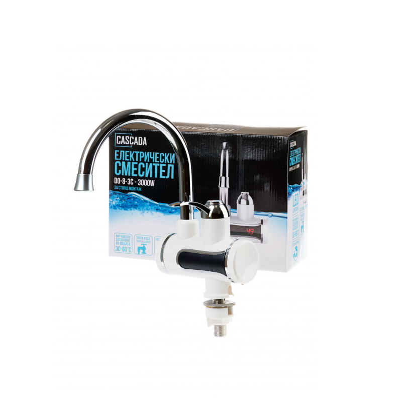 Стоящ смесител с електрически водонагревател модел DO-8-3C на марката CASCADA е с гъвкав чучур. Моделът е водоустойчив и с номинална мощност 3000W за максимално бързо нагряване. Разполага с удобен дисплей, на който се виждат градусите на водата. Ръкохватката е с индикация за топла и студена вода. Монтира се лесно, а модерният й дизайн подхоща на всеки стил и интериор.