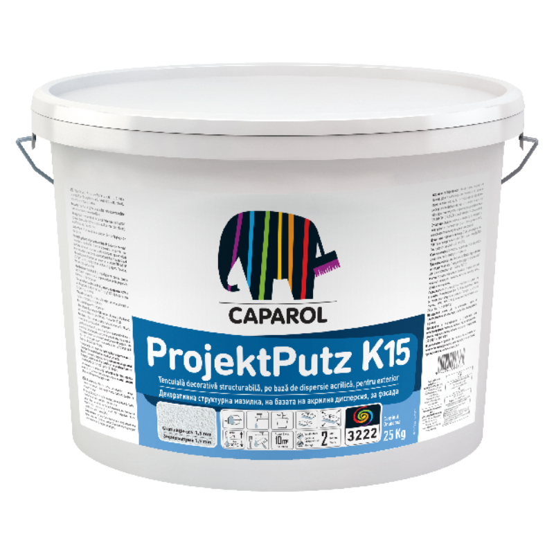 Полимерна драскана мазилка Projektputz К15 от CAPAROL в опаковка от 25кг. Структурната минерална мазилка на база акрилна дисперсия е екологична, водоразредима и се нанася както върху минерални повърхности, така и като краен слой върху топлоизолационните системи. Предлага се с големина на камъчетата 1.5мм. Мазилката е миеща се, с добра дифузия, здрава, устойчива на изветряне, изсолявания и на удар. Не се рони при нанасяне. Разход: около 2.4 - 2.6 кг/кв.м.