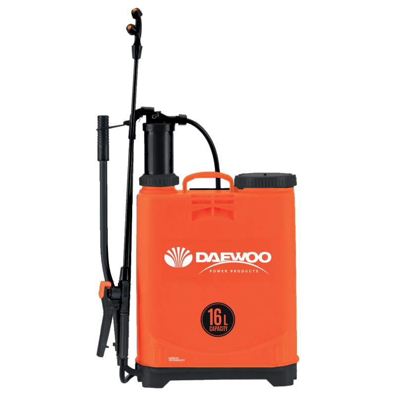 Раменна градинска пръскачка Daewoo DAPS16C с метален удължител и вместимост 16 л. Раменната пръскачка Daewoo DAPS16C е идеална за разпръскване на торове или пестициди в градината. Намира приложение също така и за дезинфекция. Конструирана е за налягане от 2-4 bar. Разполага с метален удължител, който е с дължина на маркуча 150 см.
